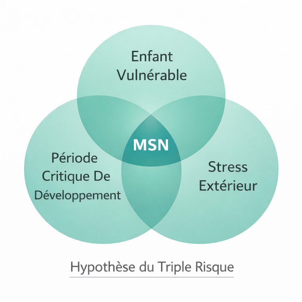 De nombreuses pistes sont actuellement explorées : génétiques, métaboliques, cardiaques, neurologiques, altération des mécanismes d’éveil, altération du système nerveux autonome, etc. C’est probablement la combinaison de plusieurs de ces facteurs qui entraîne le décès ; cette approche, appelée « hypothèse du triple risque », considère que la mort subite du nourrisson survient chez un enfant vulnérable de par ses antécédents (prématurité, faible poids de naissance, etc.), à une période critique de son développement neurologique, respiratoire et cardiaque (90 % des décès surviennent avant l’âge de 6 mois), et exposé à des facteurs de stress environnementaux (position ventrale ou latérale, tabagisme passif avant et après la naissance, couchage sur une surface inadaptée, présence d’objets dans le lit, infections, etc.). Ces trois facteurs combinés constituent une situation de risque majeur pour l’enfant [3,4].