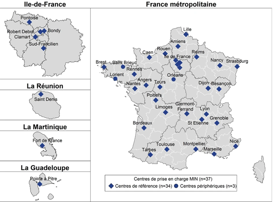 En 2025, on comptait 37 CRMIN répartis sur l’ensemble du territoire français (voir carte ci-dessous). Ces CRMIN regroupent un large éventail de compétences médicales et paramédicales multidisciplinaires, organisé au sein d’un centre hospitalier universitaire (CHU) ou d’une structure hospitalière en lien avec le CHU.